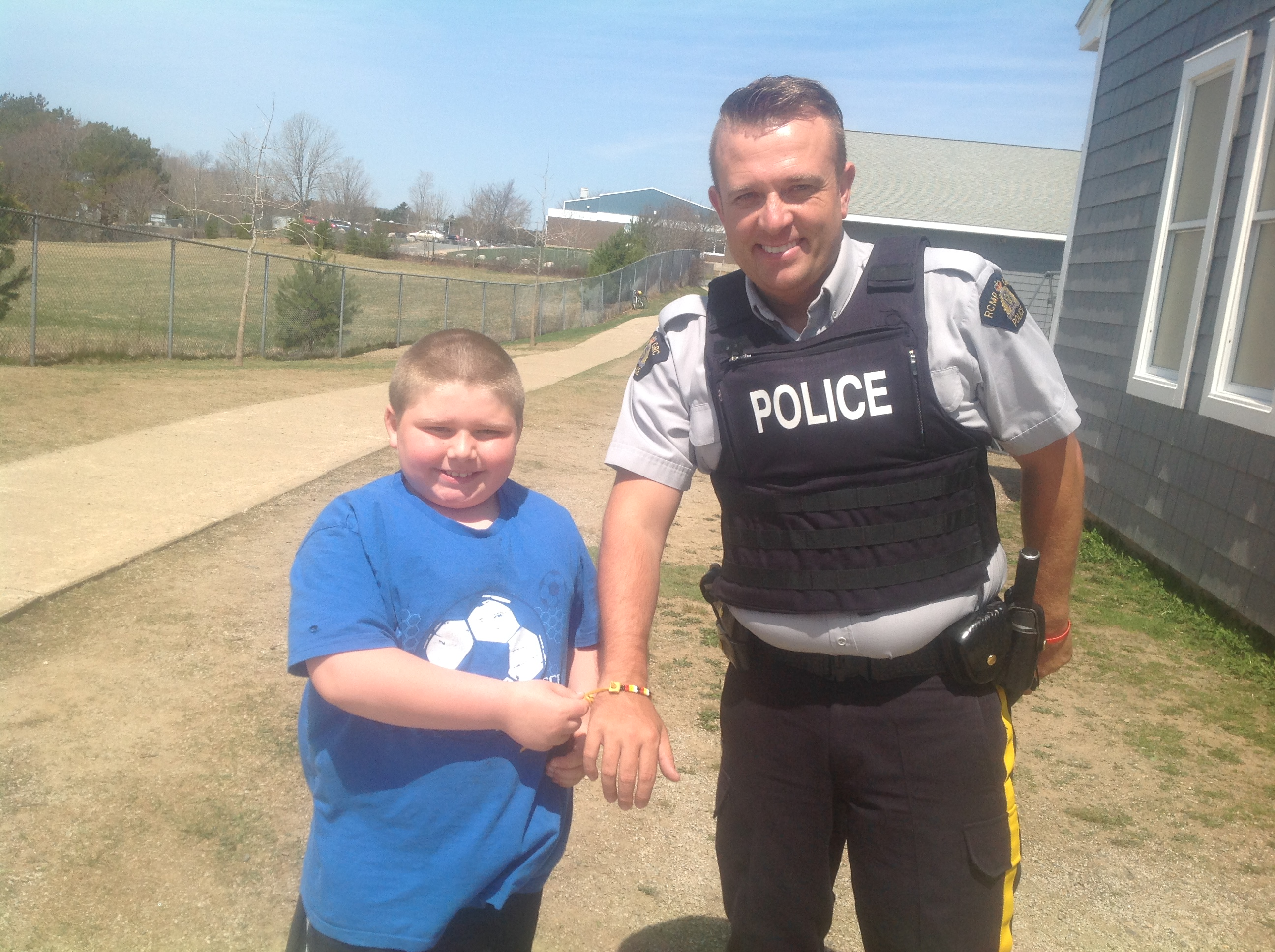 - Bryson Hynes proudly presenting Constable Rob Francis with a bracelet he made using the 4 traditional First Nations colours.